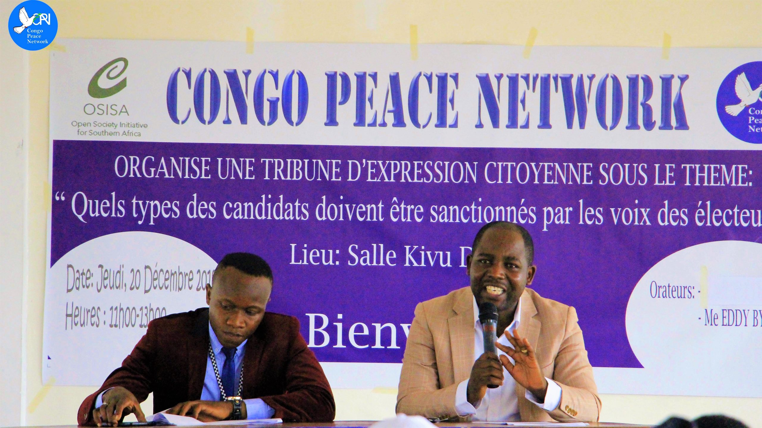 C’est dans le but de donner un espace d’expression à la population que Congo Peace Network a organisé une tribune d’expression citoyenne dans la ville de Goma, sous le thème : « quel type des candidats doivent être sanctionnés par les voix des électeurs. » Vu la pertinence du thème, à quelques jours du scrutin, plus de 120 personnes, jeunes, hommes et femmes, membres de la société civile et partisans des partis politique, ont participé à cette activité dans la grande salle de l’hôtel Kivu Dream.